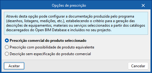 Permite configurar a documentação produzida pelo programa (desenhos, listagens, medições, etc.), estabelecendo o critério para a geração das descrições dos equipamentos, materiais ou serviços selecionados a partir dos catálogos descarregados da Open BIM Database e incluídos no projeto.