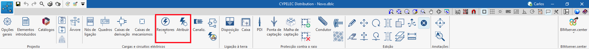 No grupo "Cargas e circuitos elétricos" da barra de ferramentas principal encontram-se as ferramentas para introduzir e atribuir recetores: