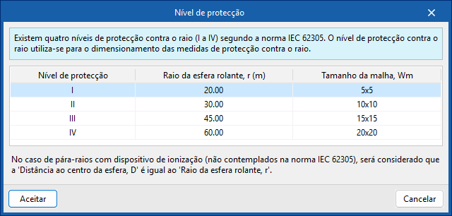 Permite configurar o nível de proteção requerido para o sistema externo de proteção contra o raio.