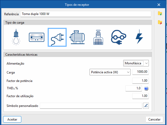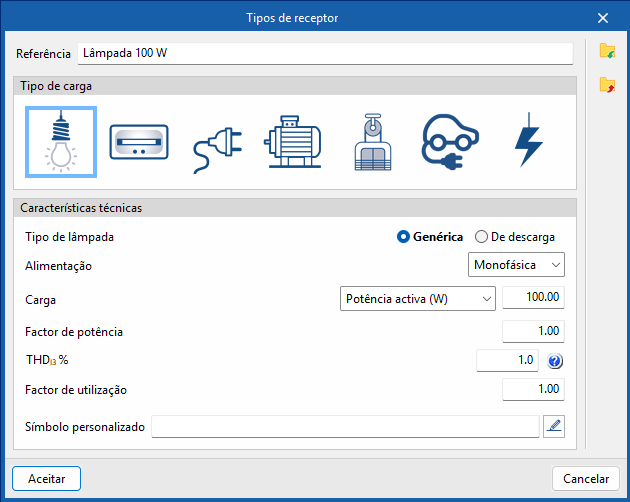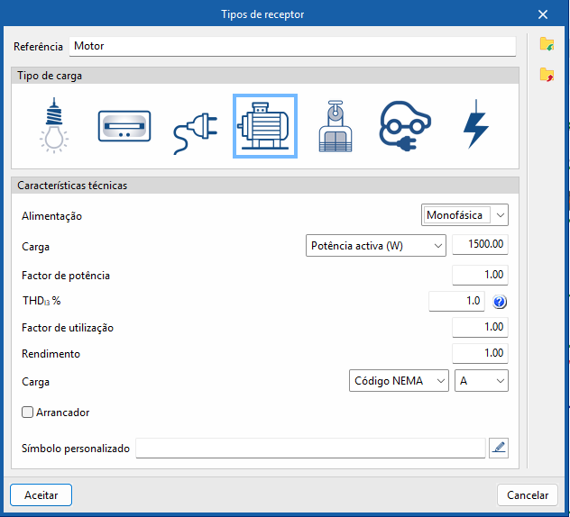 • Tipo de carga (Iluminação / Emergência / Tomada de corrente / Motor / Aparelho de elevação / Carregamento de veículo elétrico / Genérica)