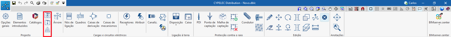 No grupo "Projeto" da barra de ferramentas principal, encontram-se opções para definir os tipos de receptores, sistemas de ligação à terra e os níveis de proteção do projeto: