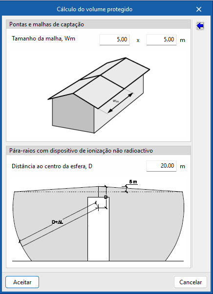 Para o efeito, é necessário definir a "Distância ao centro da esfera, D", que permite o "Cálculo do volume protegido".