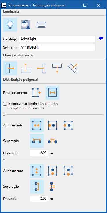 A opção "Distribuição poligonal" permite introduzir uma distribuição de luminárias em grelha cobrindo uma área poligonal.
