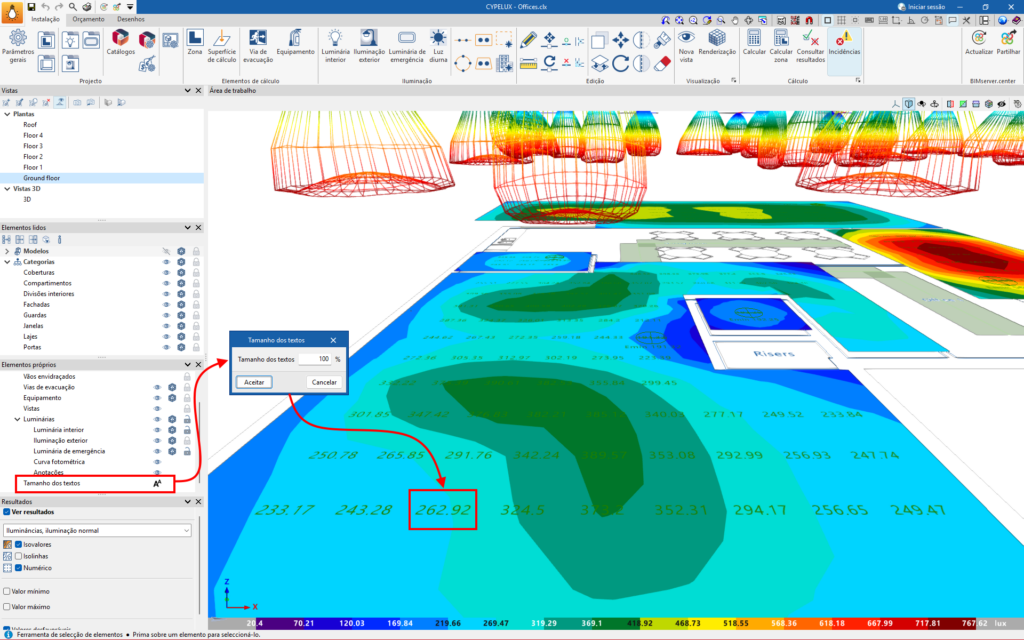 Através da opção "Tamanho dos textos" do painel "Elementos próprios", localizado por defeito à esquerda da interface, o programa permite adaptar o tamanho dos textos apresentados no ambiente 3D. O tamanho é definido introduzindo uma percentagem sobre o tamanho original.