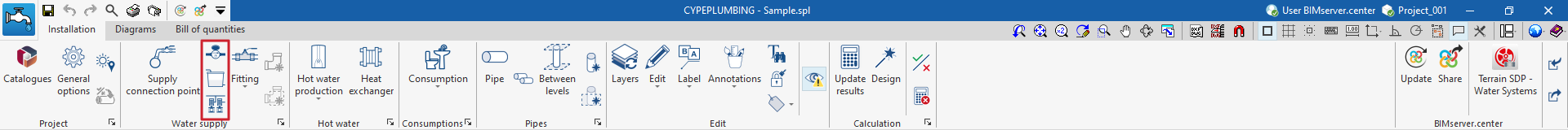 Dentro do separador "Instalação" do separador "Water Systems", no grupo "Abastecimento de água" da barra de ferramentas principal, podem ser introduzidos os seguintes elementos da instalação de abastecimento de água: