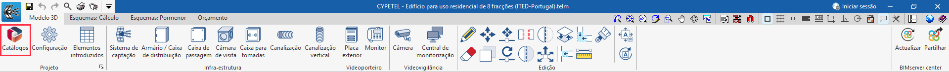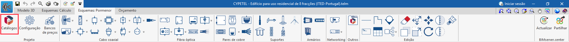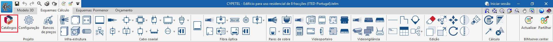 Na barra de ferramentas principal dos separadores "Modelo 3D", "Esquemas: Cálculo" e "Esquemas: Pormenor", encontra-se o grupo "Projeto". A partir deste grupo, é possível aceder a "Catálogos".