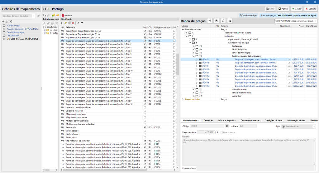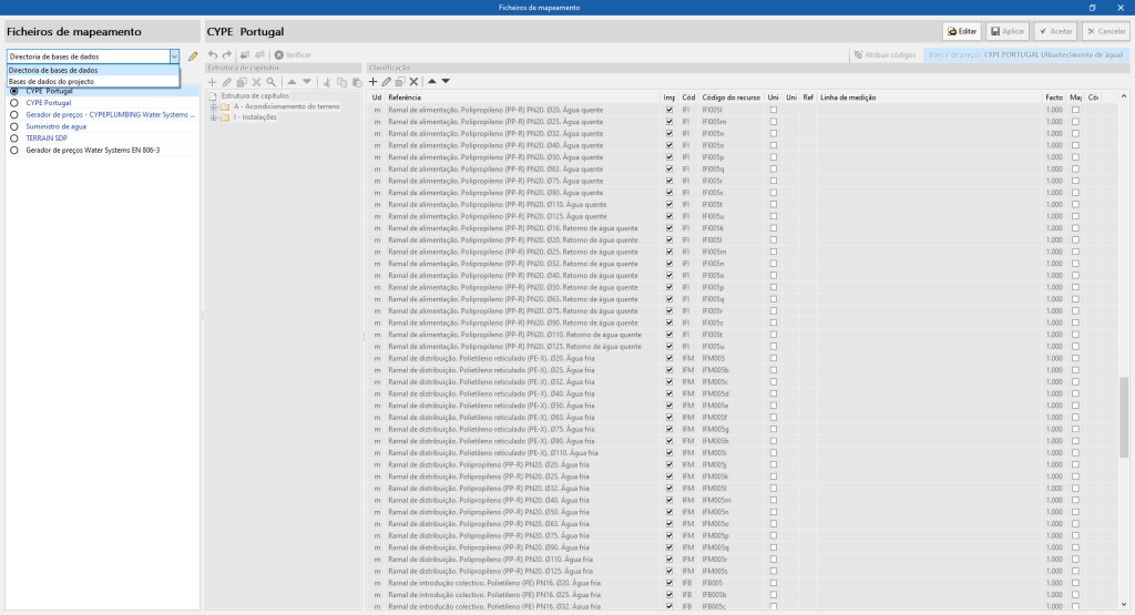 As aplicações com o separador "Orçamento" utilizam "Ficheiros de mapeamento" em combinação com o "Banco de preços" num projeto, para estabelecer a relação entre os elementos do modelo (definidos no separador "Instalação") e os recursos do banco.