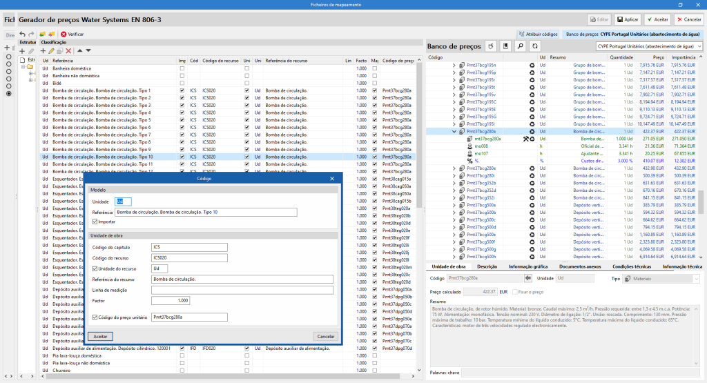 Na edição do ficheiro de mapeamento, encontramos a opção "Código de preço unitário" ao modificar um componente na lista "Classificação". Ao ativar esta opção, podemos indicar o código do preço unitário sobre o qual a quantidade do elemento do modelo será mapeada. Este será adicionado à composição do recurso descrito através dos campos "Código do recurso" e "Referência do recurso".