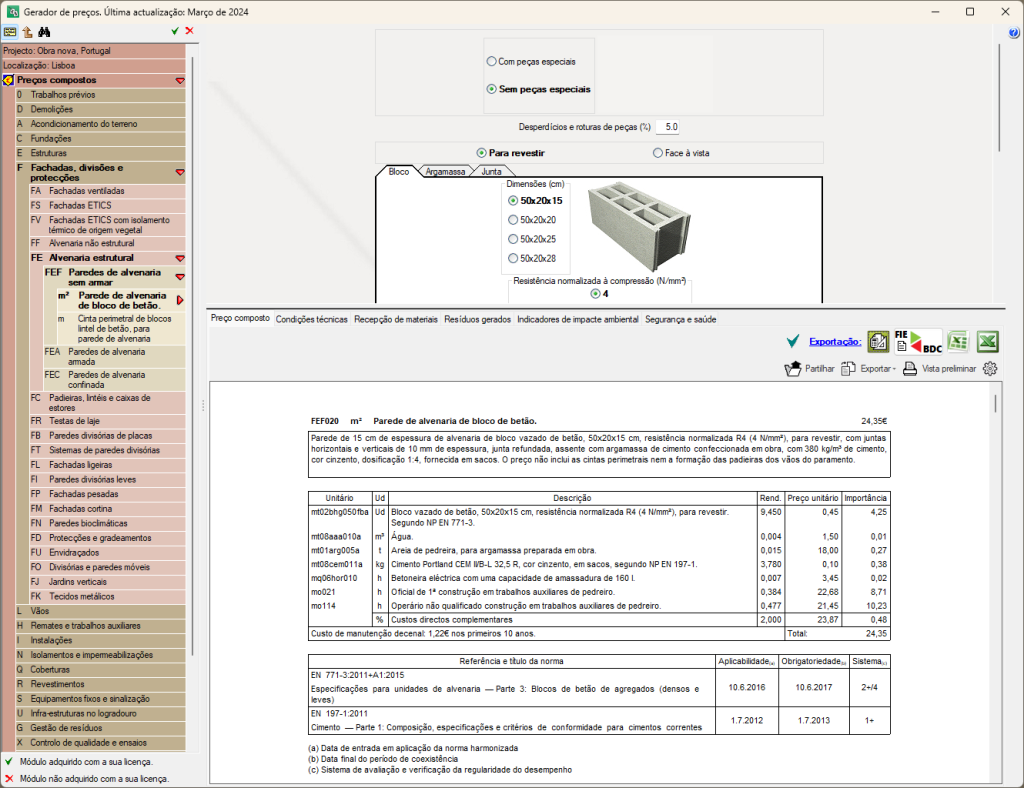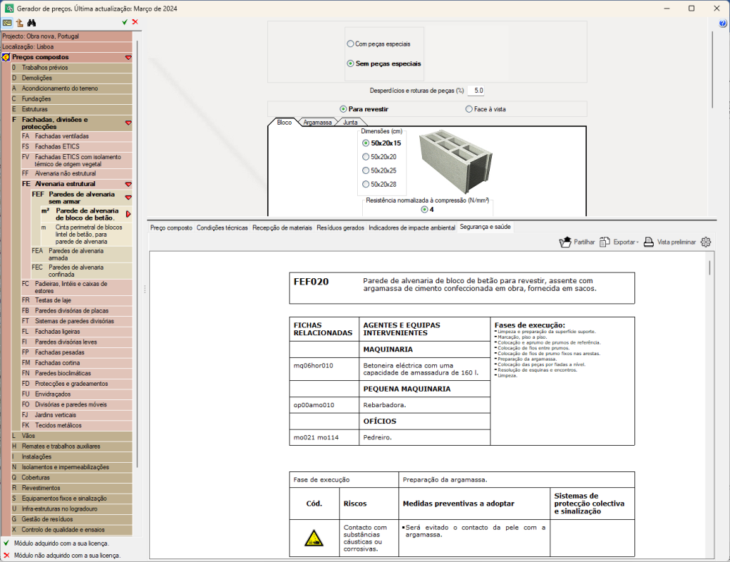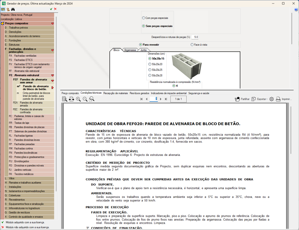 - Descrição, composição e custo da unidade de obra: São apresentados o código da unidade, a unidade de medida, o resumo, o preço, a descrição e a composição detalhada do preço unitário nas suas diferentes componentes (materiais, maquinaria, mão de obra, % de meios auxiliares, entre outros);