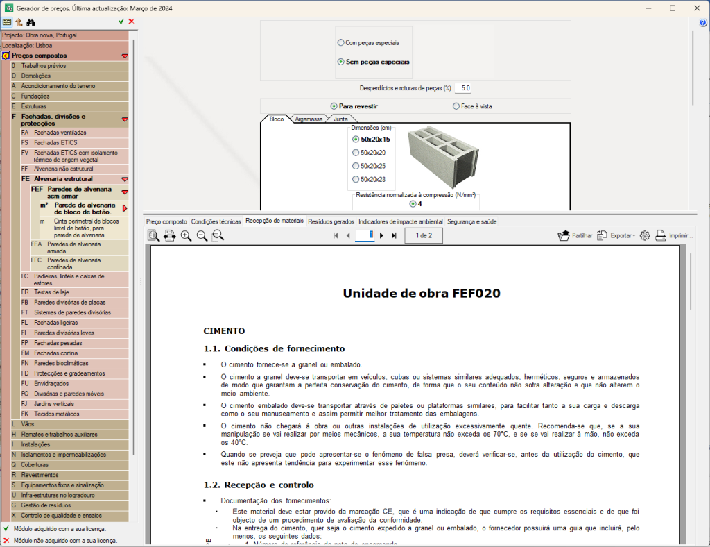 O separador "Receção de materiais" foi concebido para fornecer uma visão detalhada da forma como os materiais para cada unidade de obra se devem receber, inspecionar e armazenar, bem como para proporcionar recomendações para a sua utilização em obra.
