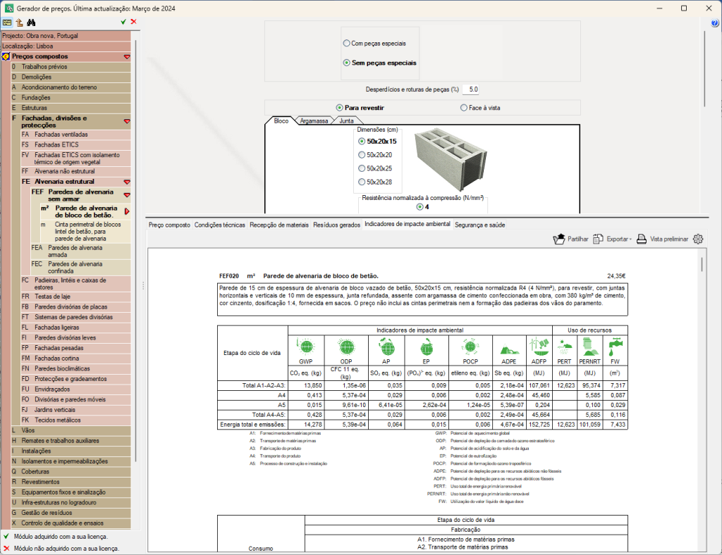 - Etapas do ciclo de vida: Os impactes são discriminados de acordo com as diferentes etapas, como a aquisição de matérias-primas, o transporte, o fabrico, a construção e outras.