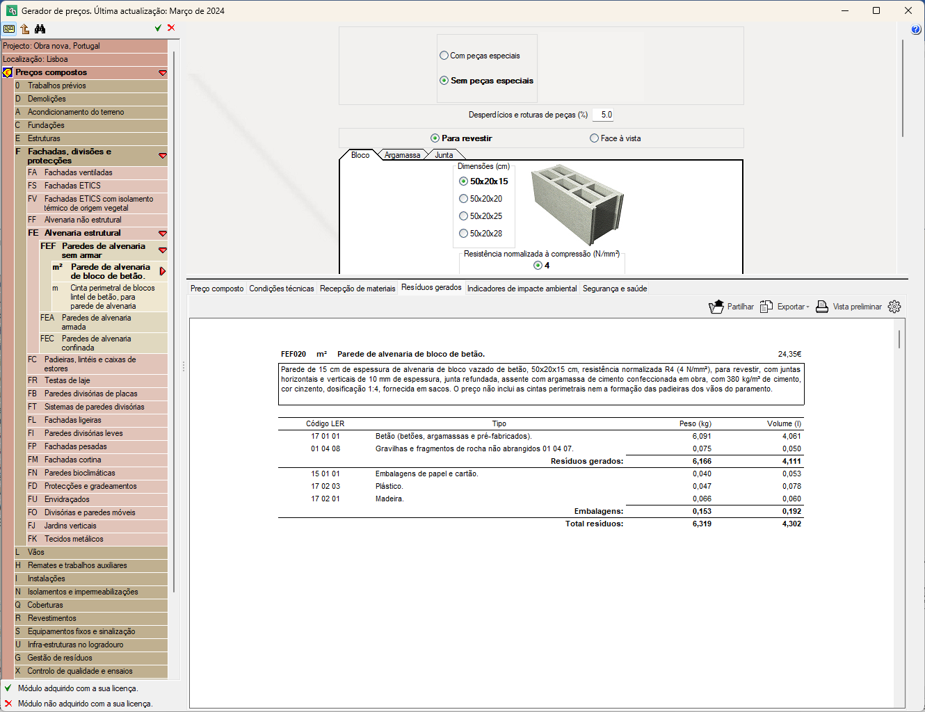 - Identificação dos resíduos de embalagens: Para além dos resíduos diretamente relacionados com a unidade de obra, são indicados os resíduos gerados pelas embalagens associadas. Mais uma vez, são classificados por tipo e é dada uma estimativa do peso e do volume.