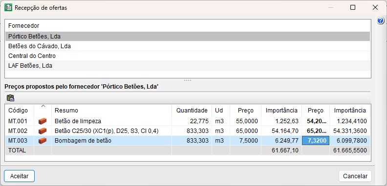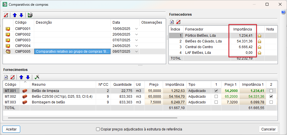 Com a opção "Comparativos de compras" é possível visualizar as ofertas recebidas a fim de selecionar a melhor e poder preparar os contratos. Como ajuda, no diálogo onde se visualiza o comparativo de compras, os preços mais baixos são destacados a verde e os mais altos a vermelho. Também se apresentam os totais dos fornecimentos selecionados por fornecedor e futuro contrato.
