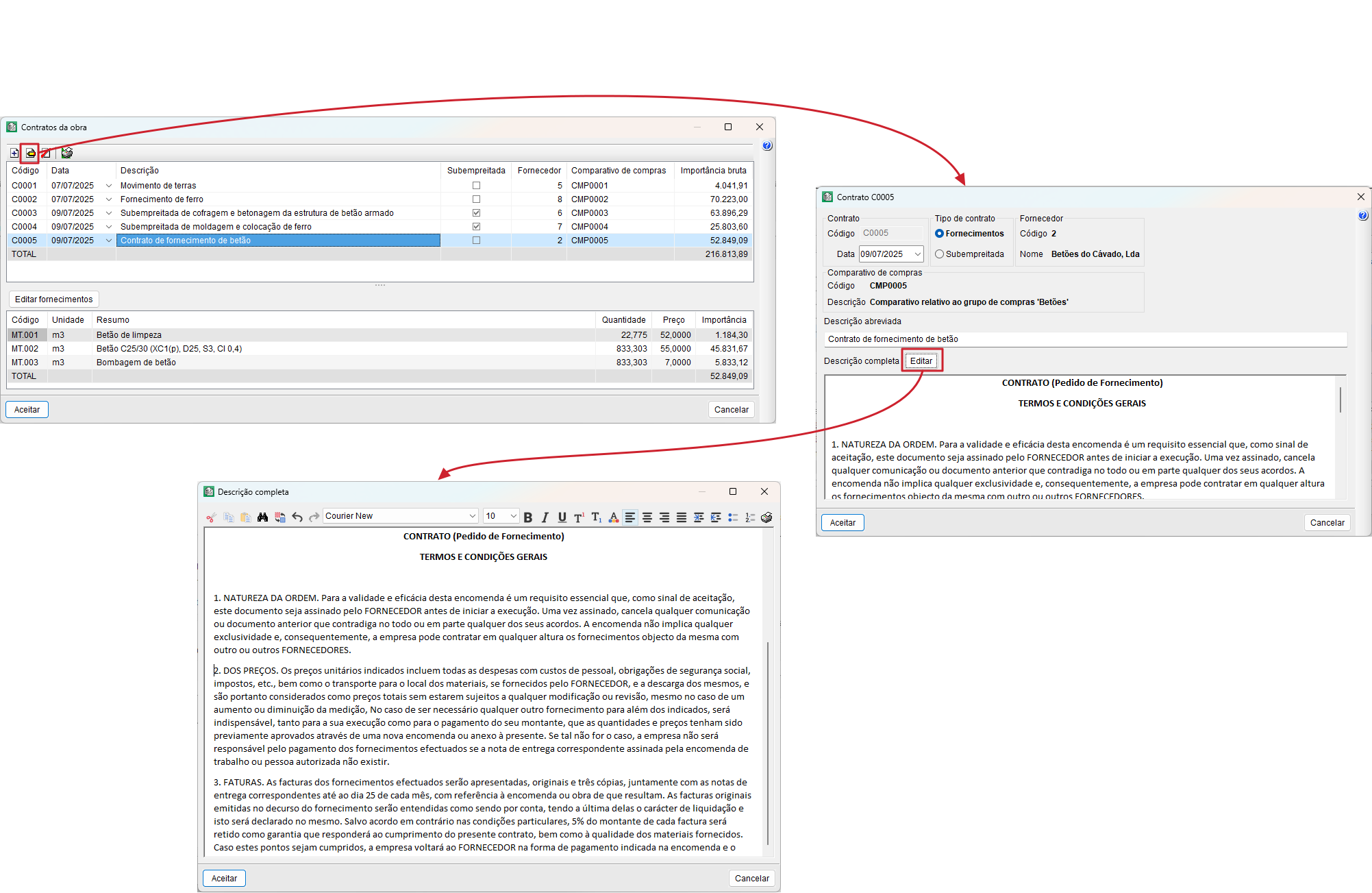 Com a opção "Gerar contratos" o utilizador pode criar os contratos dos fornecedores (contratos de fornecimento ou de aluguer) e subempreiteiros (contratos de execução) que estão pendentes de serem contratados. A opção "Contratos da obra" abre um diálogo contendo a lista dos contratos gerados para a sua visualização e edição. A edição de um contrato abre um editor de texto onde o utilizador pode realizar: