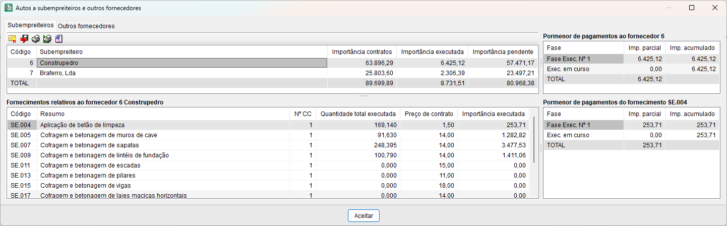 No diálogo Autos a subempreiteiros e outros fornecedores (menu "Controle de obra", "Ver", "Autos a subempreiteiros e outros fornecedores") é possível visualizar a previsão dos pagamentos a subempreiteiros e outros fornecedores, detalhada por fornecedor e por fases de execução ou meses. Também é possível consultar os fornecimentos de cada fornecedor e o detalhe dos pagamentos para cada um dos fornecimentos.